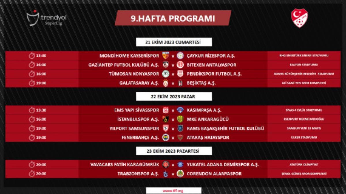 Ligin 9. haftasındaki Galatasaray-Beşiktaş karşılaşması 21 Ekim Cumartesi saat 19.00'da Ali Sami Yen Spor Kompleksi'nde oynanacak.