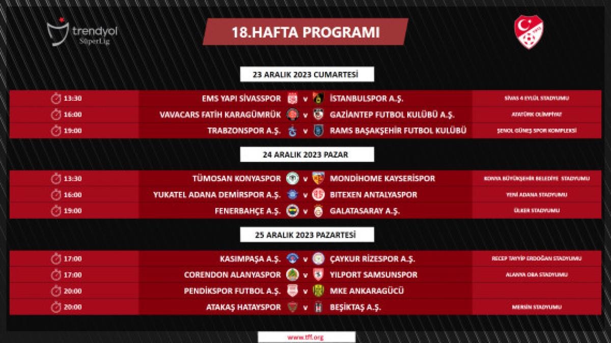 15. haftada 9 Aralık Cumartesi günü saat 19.00'da Beşiktaş-Fenerbahçe, 18. haftada ise 24 Aralık Pazar günü saat 19.00'da Galatasaray-Fenerbahçe derbileri yapılacak.