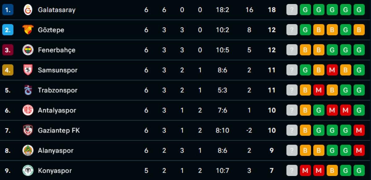 - Galatasaray, en yakın rakibi Göztepe'nin 6 puan önünde lider durumda.