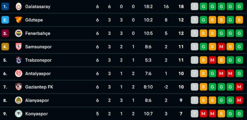 Süper Lig'de 6. hafta geride kalırken Galatasaray, en yakın rakibi Göztepe'nin 6 puan önünde liderliğini sürdürdü.