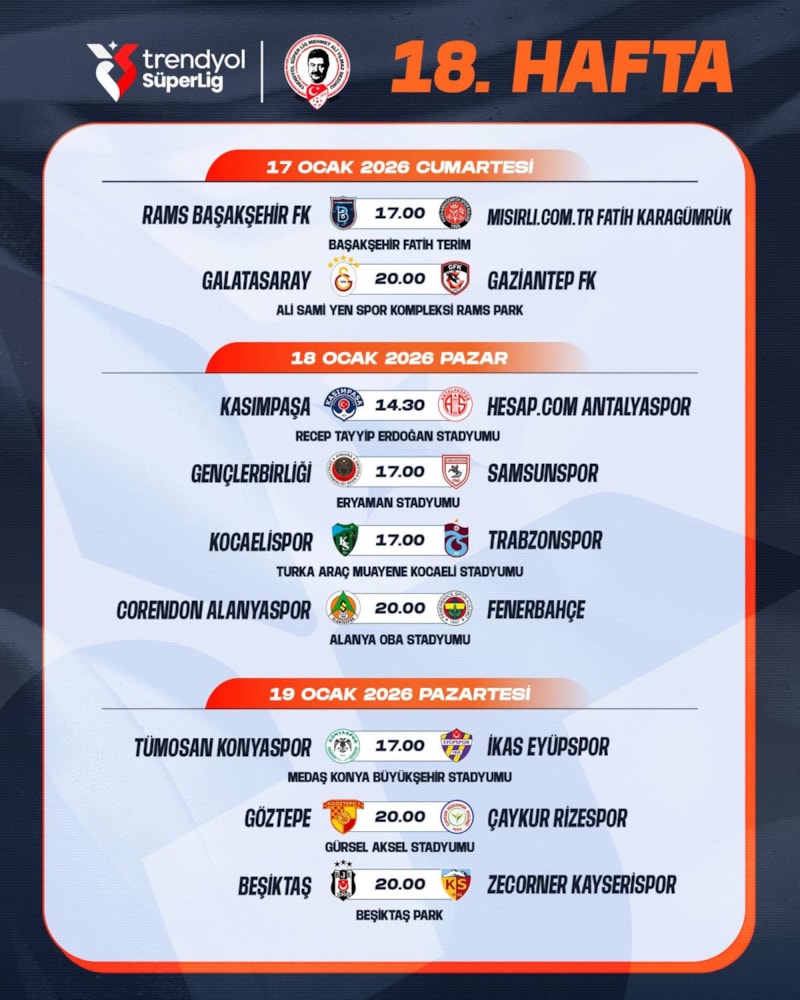 Türkiye Futbol Federasyonu, Süper Lig’de 18 ve 19. haftada oynanacak maçların programını açıkladı.