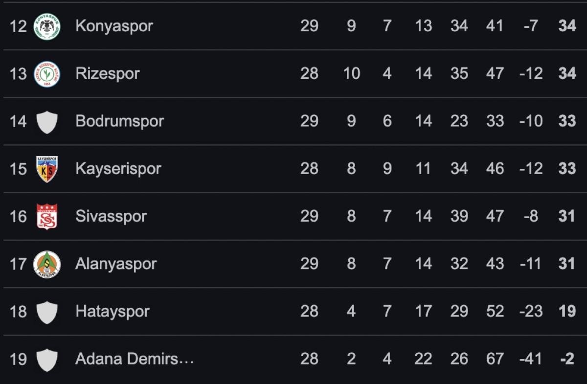 İşte alt sıralarda puan durumu...