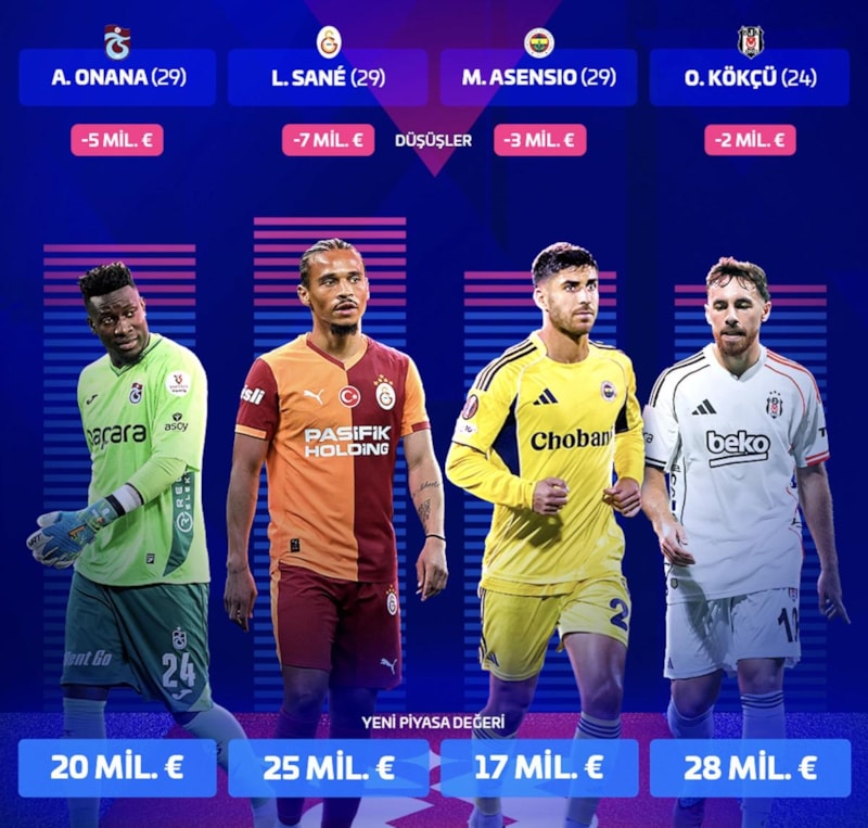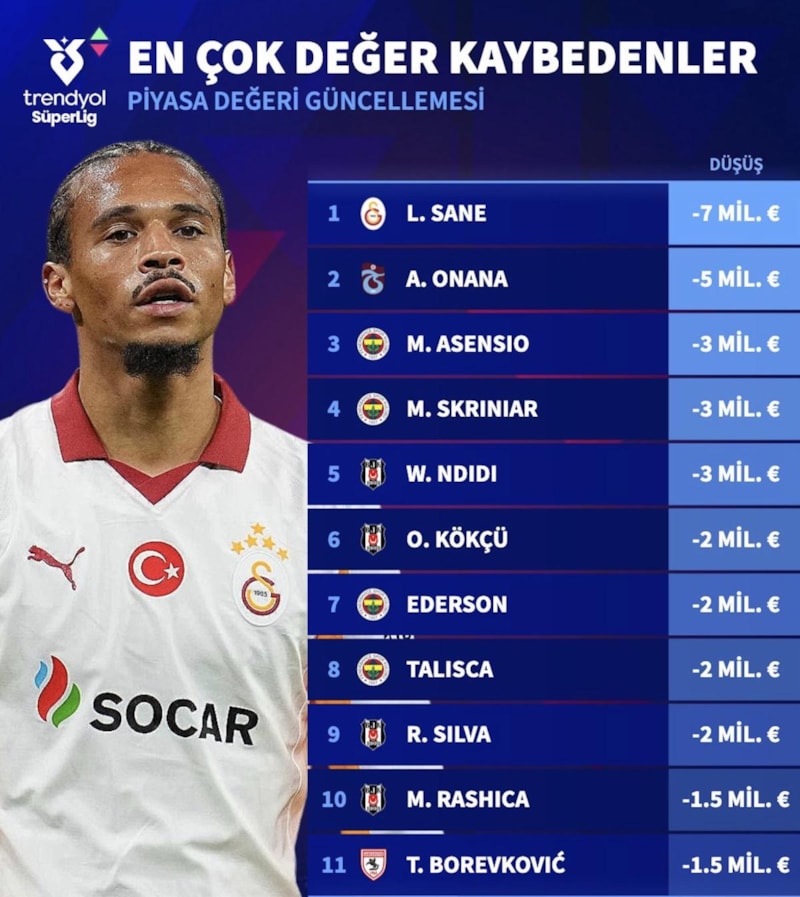 En çok değer kaybeden isim ise yine Galatasaray forması giyen Alman yıldız Leroy Sane oldu.