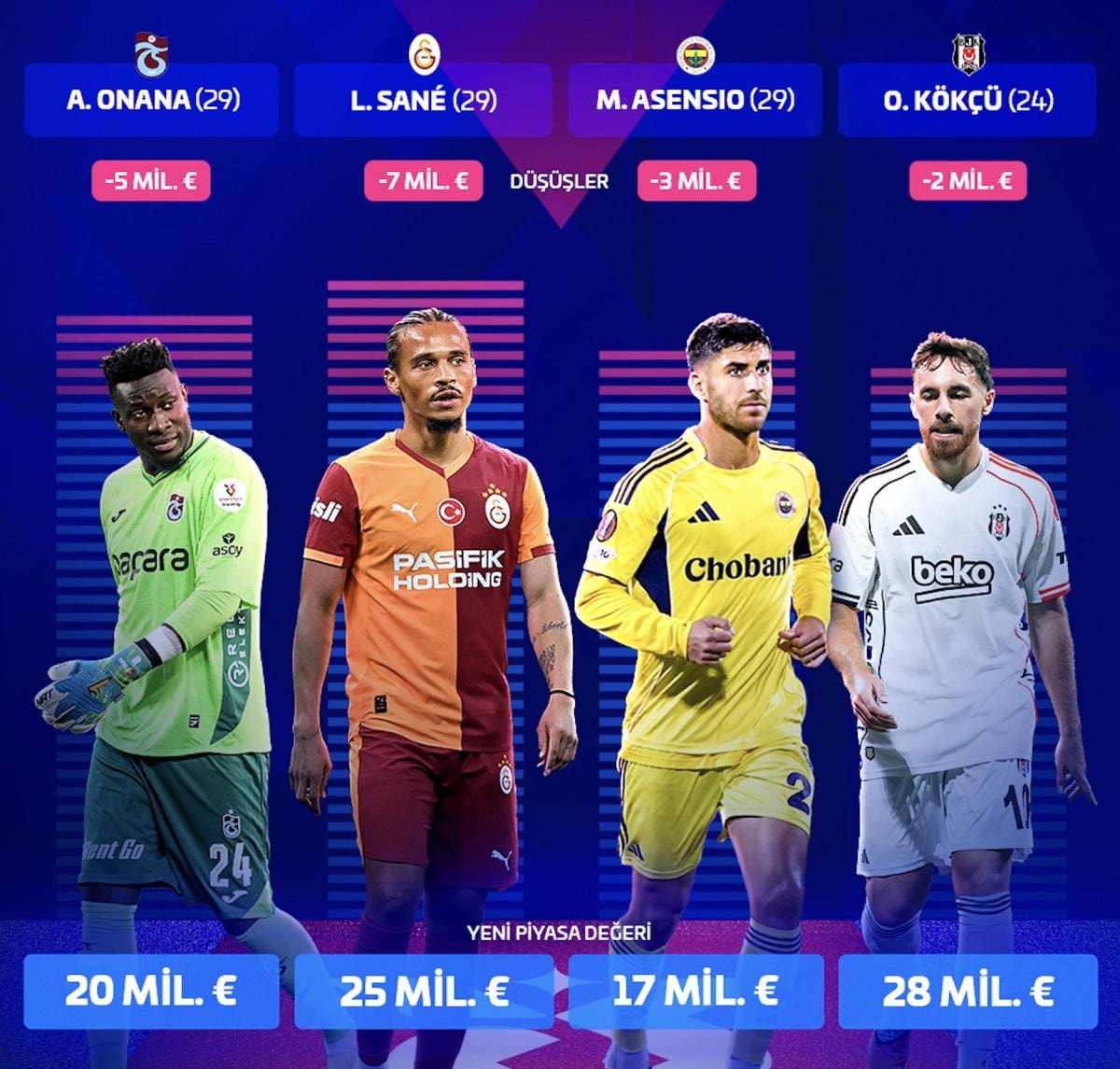 - Değer kaybeden listesinde Sane'yi, Andre Onana, Orkun Kökçü ve Marco Asensio izledi.