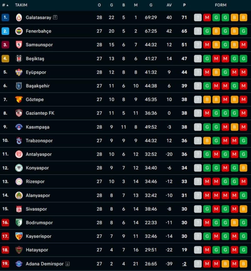 Beşiktaş'a 2-1 mağlup olan ve bu sezon ligde ilk yenilgisini yaşayan lider Galatasaray, 71 puanda kaldı.