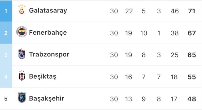 Üçüncü sırada yer alan Trabzonspor ise 65 puanla zirvedeki ikiliyi takip ediyor.