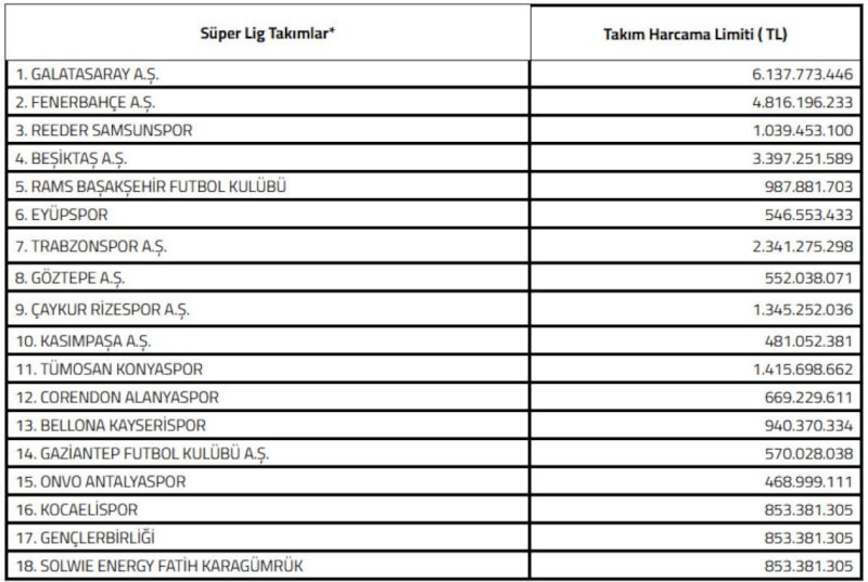 Süper Lig ekiplerinin yeni sezon harcama limitleri (Türk lirası) şöyle: