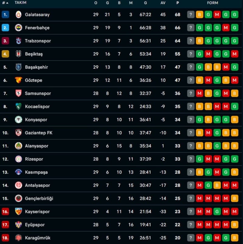Galatasaray'ın Kocaelispor karşısında iki puan bırakması sonrasında şampiyonluk yarışında işler bir hayli karıştı. İşte zirvede son durum...