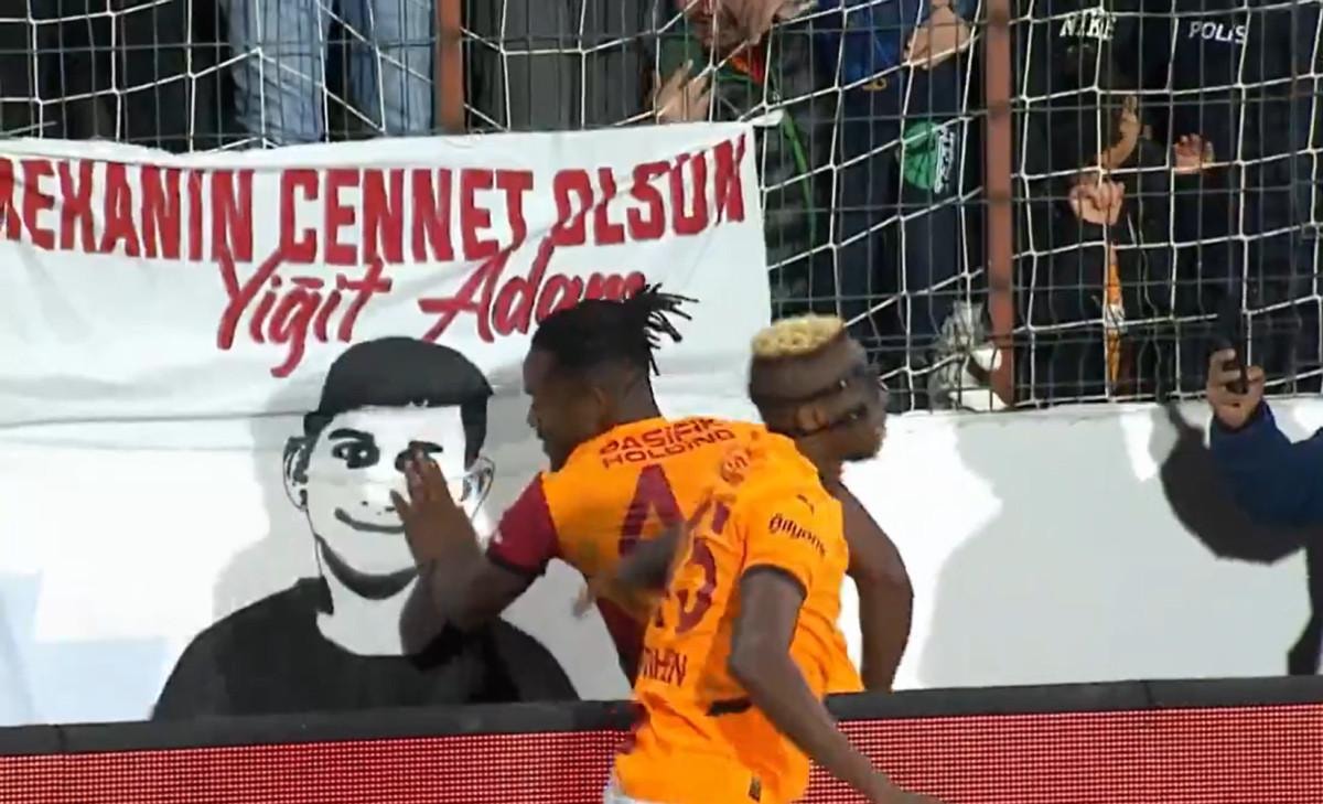 Öte yandan başarılı futbolcu, attığı golden sonra, Tottenham maçına gelirken trafik kazasında hayatını kaybeden minik taraftar Yiğit Kurt'un pankartına yöneldi ve golü ona adadı.