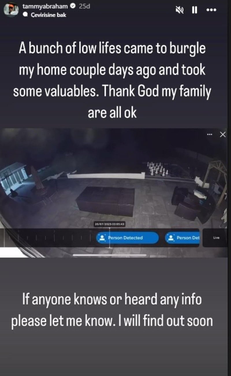 Beşiktaş'ın yeni transfer Tammy Abraham, Londra’daki evinin soyulduğunu ve değerli eşyalarının çalındığını açıkladı.
