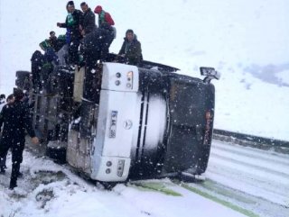 Yoldaki buzlanmanın da etkisiyle otobüs, kontrolden çıkarak devrildi. Kazada 2 kişi hafif yaralandı.