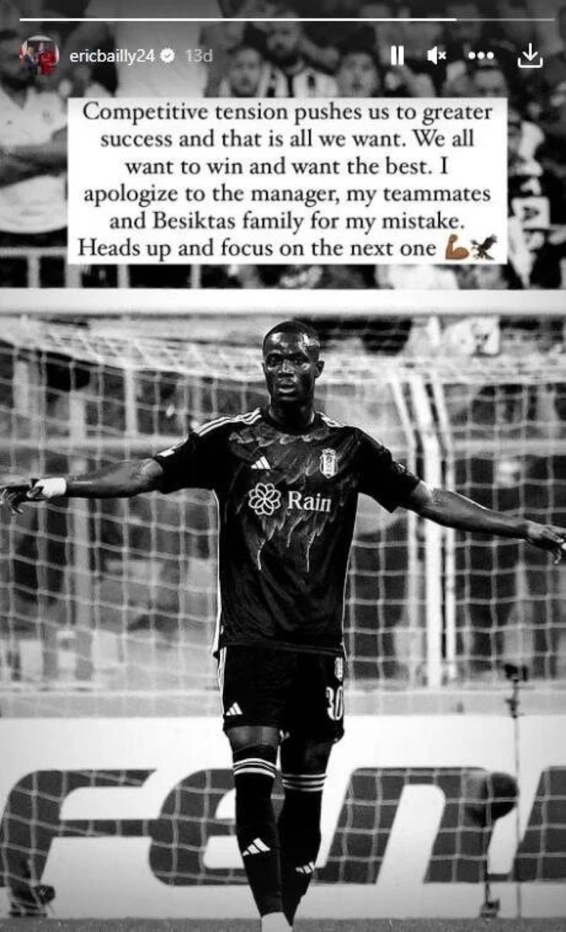Burak Yılmaz'ın karşılaşma sonrası Eric Bailly'nin Tayfur Bingöl'ün yakasından tuttuğu ve tepki gösterdiğini açıkladığı Fildişi Sahilli stoper, sosyal medya hesabından özür diledi.