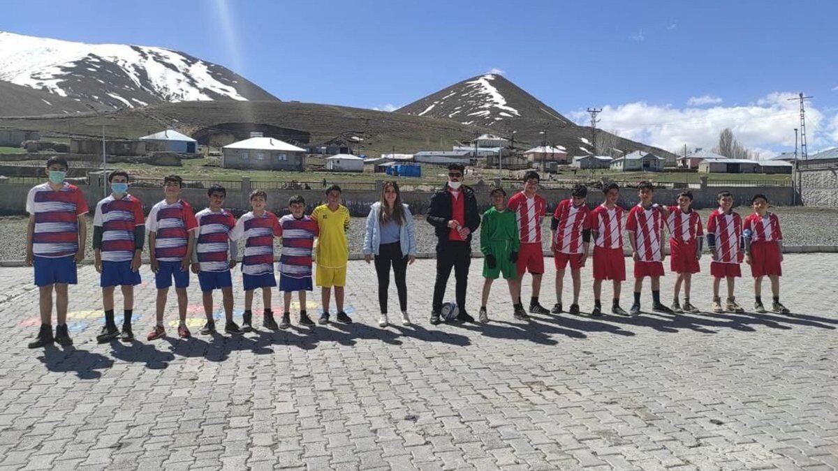 Taylan Antalyalı'nın gönderdiği malzemeler okula ulaştı. Birbirinden renkli formaları sırtlarına geçiren öğrenciler, futbol topunun peşinde koştu.