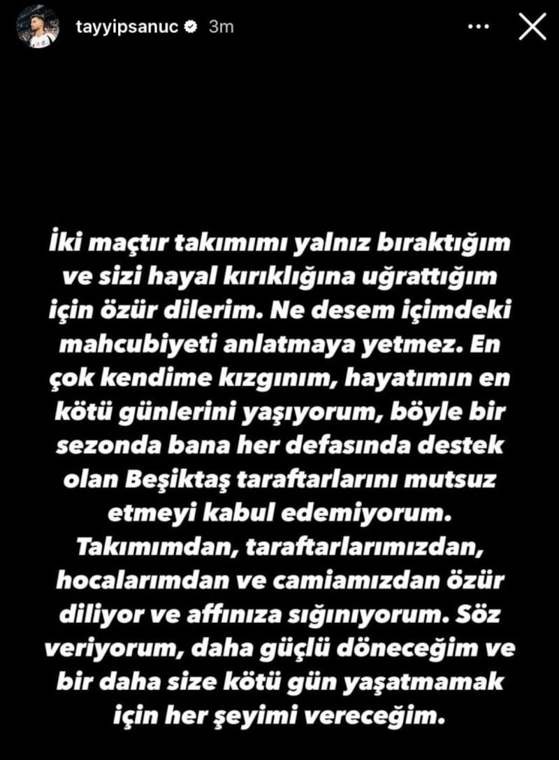 İki maçtır takımımı yalnız bıraktığım ve sizi hayal kırıklığına uğrattığım için özür dilerim. Ne desem içimdeki mahcubiyeti anlatmaya yetmez. En çok kendime kızgınım, hayatımın en kötü günlerini yaşıyorum. Böyle bir sezonda bana her defasında destek olan Beşiktaş taraftarlarını mutsuz etmeyi kabul edemiyorum. Takımımdan, taraftarlarımızdan, hocalarımdan ve camiamızdan özür diliyor ve affınıza sığınıyorum. Söz veriyorum, daha güçlü döneceğim ve bir daha size kötü gün yaşatmamak için her şeyimi vereceğim.