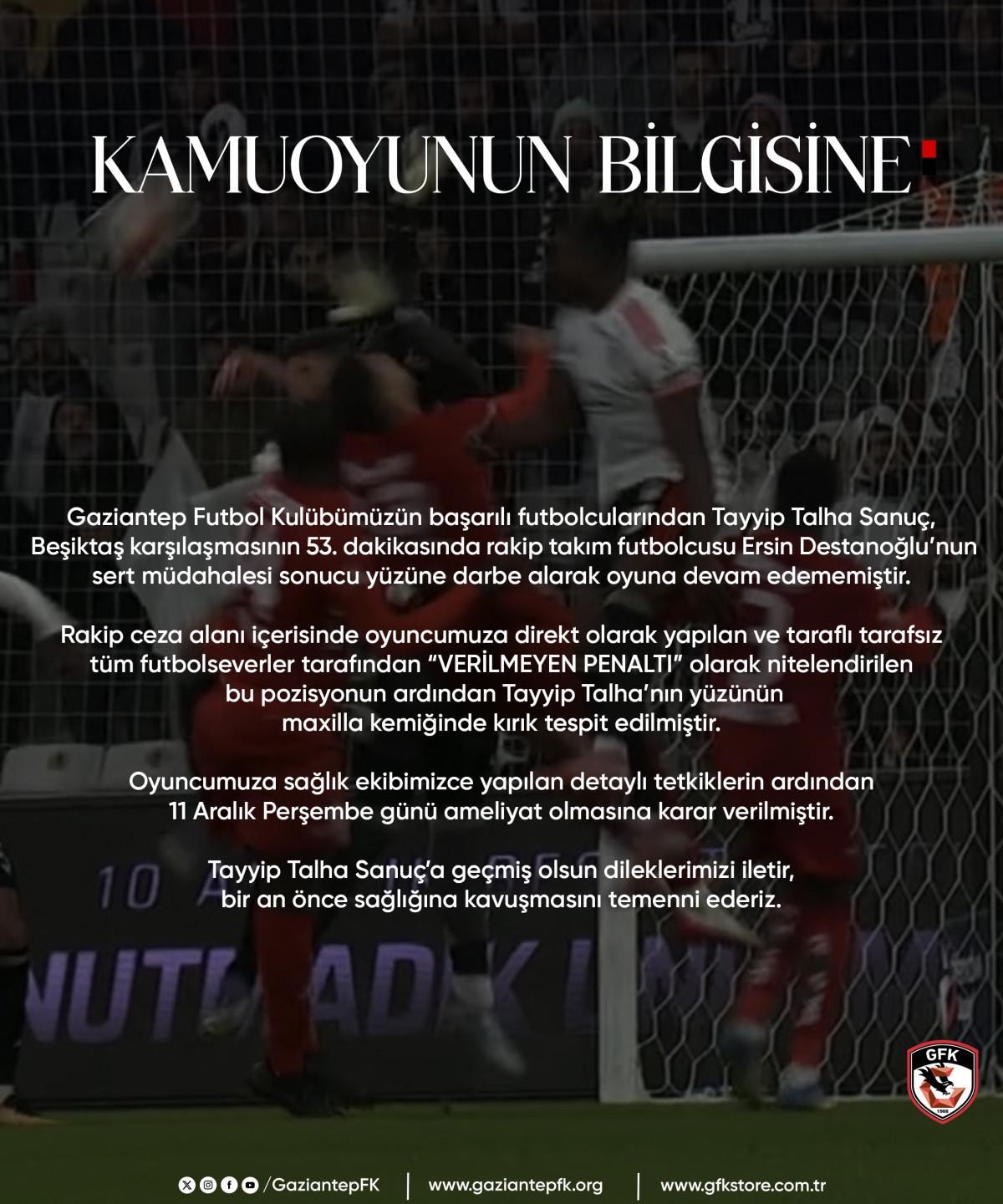 - Gaziantep FK, Beşiktaş maçında sakatlanan Tayyip Talha Sanuç'un yüz kemiğinde kırık tespit edildiğini duyurdu.