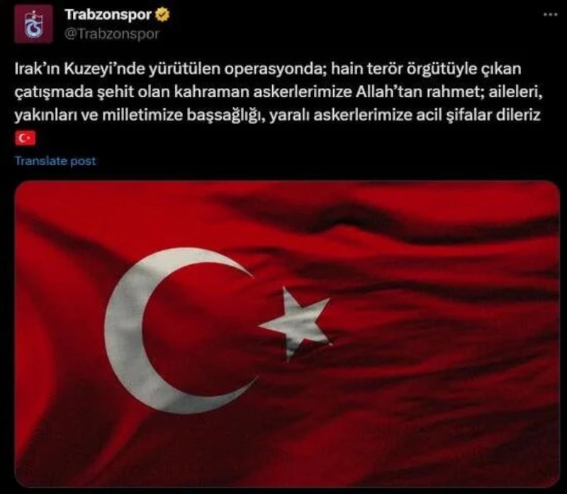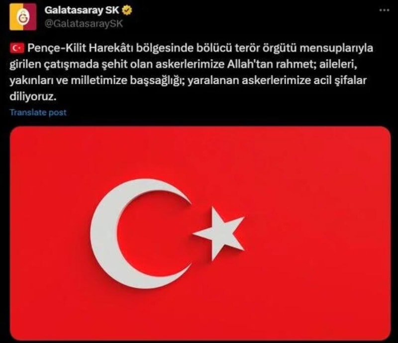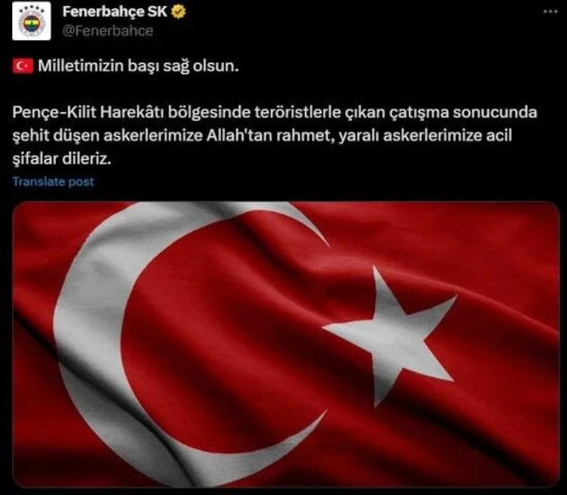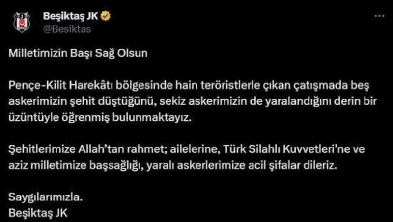Spor kulüpleri sosyal medya hesaplarından Pençe-Kilit Harekatı bölgesinde şehit olan askerler için paylaşımda bulundu.