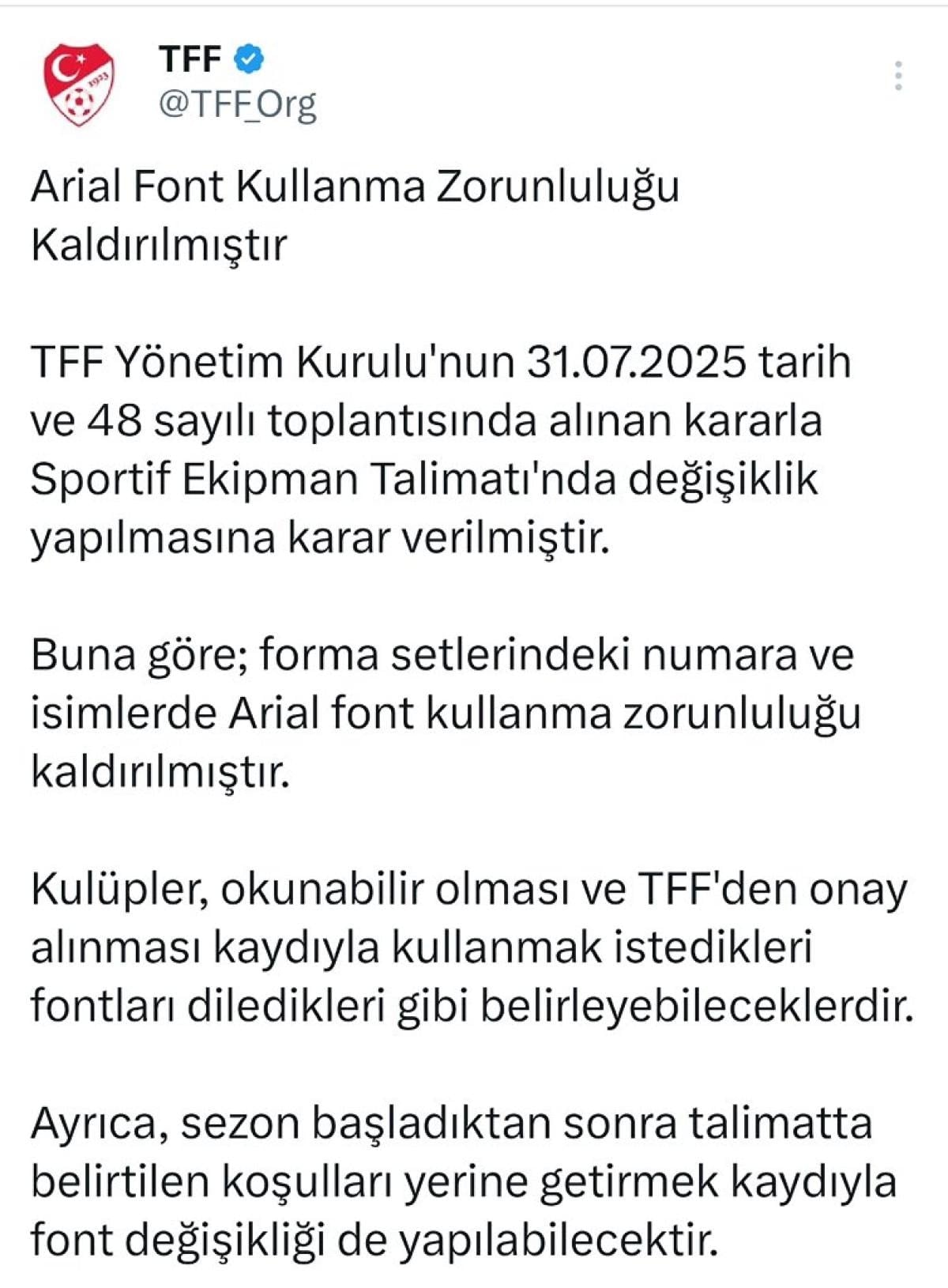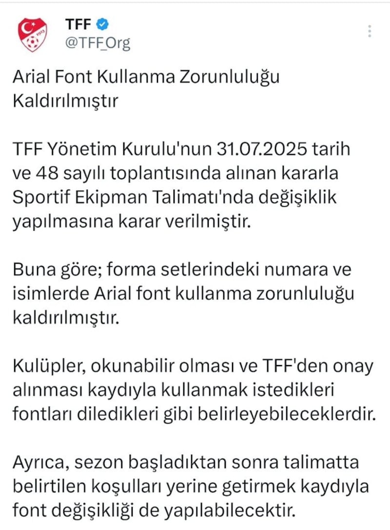 TFF Yönetim Kurulu'nun 31.07.2025 tarih ve 48 sayılı toplantısında alınan kararla Sportif Ekipman Talimatı'nda değişiklik yapılmasına karar verilmiştir. Buna göre; forma setlerindeki numara ve isimlerde Arial font kullanma zorunluluğu kaldırılmıştır. Kulüpler, okunabilir olması ve TFF'den onay alınması kaydıyla kullanmak istedikleri fontları diledikleri gibi belirleyebileceklerdir. Ayrıca, sezon başladıktan sonra talimatta belirtilen koşulları yerine getirmek kaydıyla font değişikliği de yapılabilecektir.