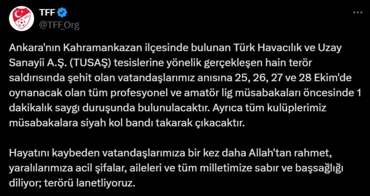 Ankara'nın Kahramankazan ilçesinde bulunan Türk Havacılık ve Uzay Sanayii A.Ş. (TUSAŞ) tesislerine yönelik gerçekleşen hain terör saldırısında şehit olan vatandaşlarımız anısına 25, 26, 27 ve 28 Ekim'de oynanacak olan tüm profesyonel ve amatör lig müsabakaları öncesinde 1 dakikalık saygı duruşunda bulunulacaktır. Ayrıca tüm kulüplerimiz müsabakalara siyah kol bandı takarak çıkacaktır.