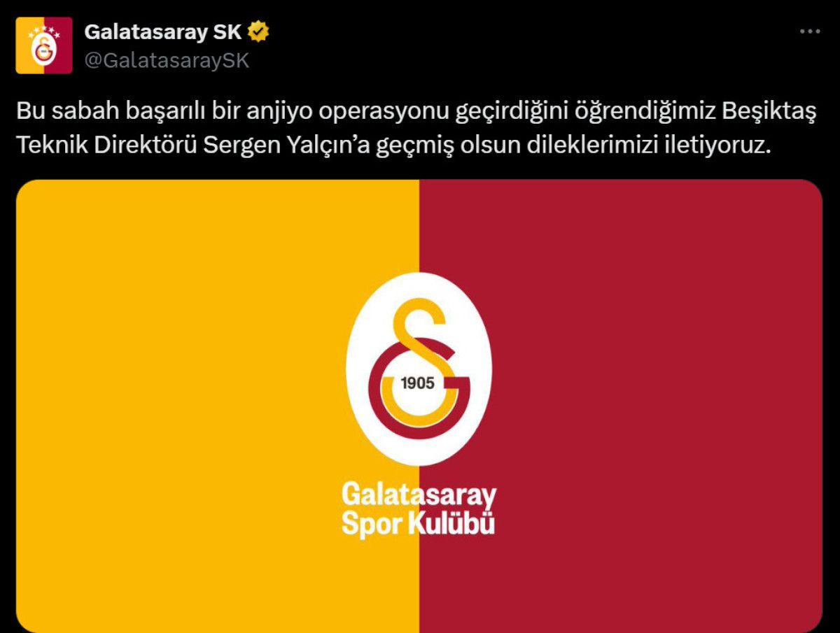 Galatasaray Kulübü'nün paylaşımında ise "Bu sabah başarılı bir anjiyo operasyonu geçirdiğini öğrendiğimiz Beşiktaş Teknik Direktörü Sergen Yalçın'a geçmiş olsun dileklerimizi iletiyoruz." denildi.