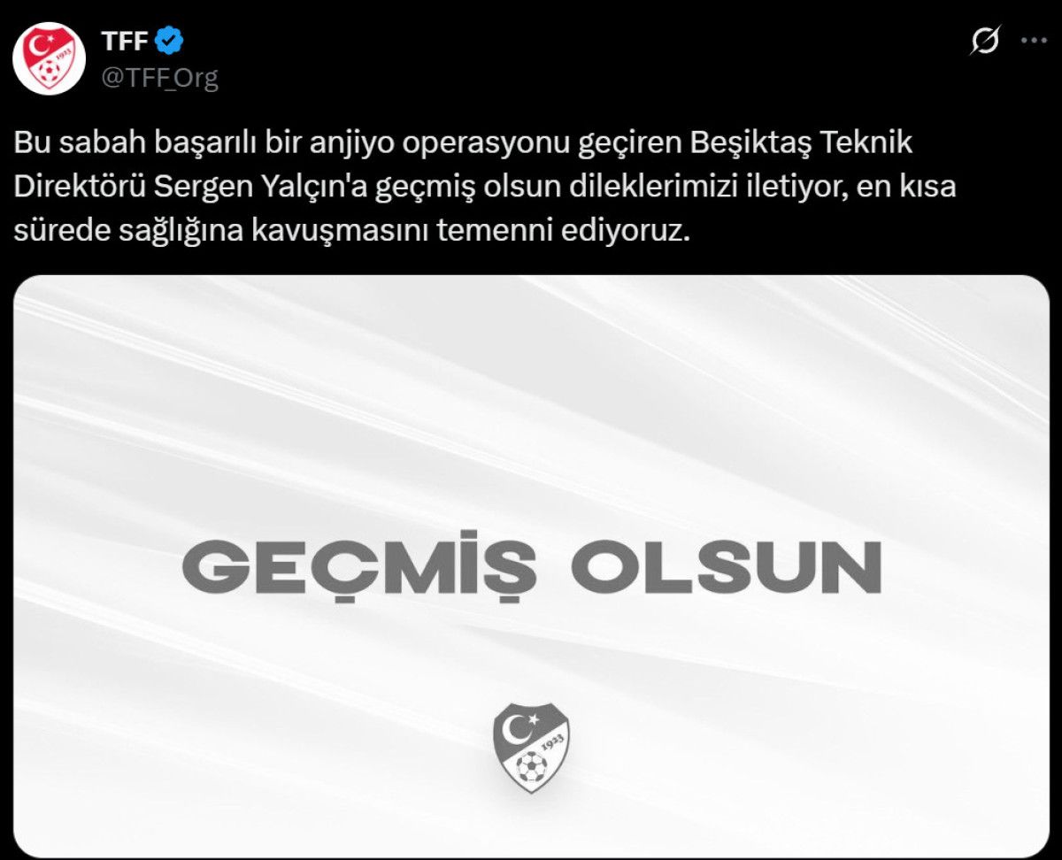 TFF'nin mesajında da "Bu sabah başarılı bir anjiyo operasyonu geçiren Beşiktaş Teknik Direktörü Sergen Yalçın'a geçmiş olsun dileklerimizi iletiyor, en kısa sürede sağlığına kavuşmasını temenni ediyoruz." ifadesi kullanıldı.