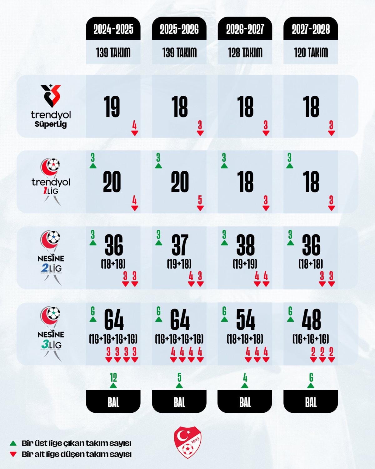 Kulüp sayısının 139'dan 120'ye düşürüleceği de belirtilip, "Kulüp gelirlerinin artırılması ve daha güçlü bir rekabet ortamı oluşturulması amacıyla, 2025-2026 sezonunda 139 takımın mücadele edeceği profesyonel liglerdeki takım sayısının kademeli olarak azaltılmasına gidilecektir ve hâlihazırda 139 olan profesyonel takım sayısı, aşağıdaki görselde sezonlara göre belirtilen düşme ve çıkma sayılarına göre 120'ye düşürülecektir." ifadeleri kullanıldı