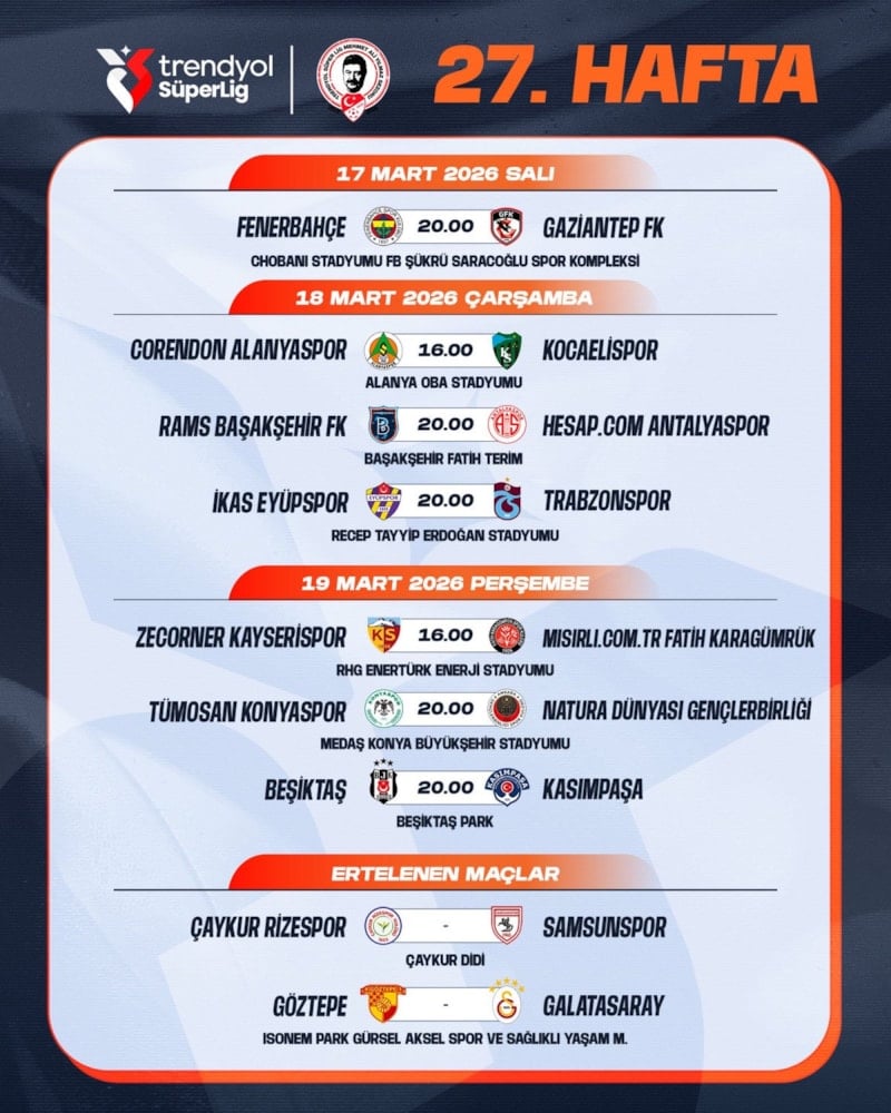 Trendyol Süper Lig Mehmet Ali Yılmaz Sezonu 26-27. hafta müsabakalarına ilişkin program açıklanmıştır. 21.01.2026 tarihinde Trendyol Süper Lig 27. hafta müsabakalarının tarihlerinde değişiklik yapıldığına ilişkin açıklamada belirtildiği üzere, Galatasaray ve Samsunspor kulüplerimizin UEFA Şampiyonlar Ligi ve UEFA Konferans Ligi'nde Son 16 Turuna yükselmiş olmalarından dolayı, Göztepe - Galatasaray ile Çaykur Rizespor - Samsunspor Trendyol Süper Lig 27. Hafta müsabakaları ileri bir tarihe ertelenmiştir. Müsabakaların oynanacağı tarihler daha sonra ilan edilecektir.