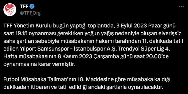 TFF Yönetim Kurulu bugün yaptığı toplantıda, 3 Eylül 2023 Pazar günü saat 19.15 oynanması gerekirken yoğun yağış nedeniyle oluşan elverişsiz saha şartları sebebiyle müsabakanın hakemi tarafından 11. dakikada tatil edilen Yılport Samsunspor - İstanbulspor A.Ş. Trendyol Süper Lig 4. Hafta müsabakasının 8 Kasım 2023 Çarşamba günü saat 20.00'de oynanmasına karar vermiştir.