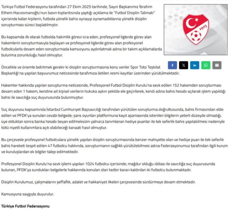 TFF'den yapılan açıklamada, "Türkiye Futbol Federasyonu tarafından 27 Ekim 2025 tarihinde, Sayın Başkanımız İbrahim Ethem Hacıosmanoğlu'nun basın toplantısında yaptığı açıklama ile Futbol Disiplin Talimatı içerisinde kalan kişilerin, futbola yönelik bahis oynayıp oynamadıklarına yönelik disiplin soruşturması süreci başlatılmıştır. Bu kapsamda ilk olarak futbolda hakimlik görevi icra eden, profesyonel liglerde görev alan hakemlerin soruşturmasıyla başlayan ve profesyonel liglerde görev alan profesyonel futbolcularla devam eden soruşturmada kamuoyunu aydınlatmak adına birtakım açıklamalarda bulunma zorunluluğu hasıl olmuştur. Öncelikle ve önemle belirtmek gerekir ki disiplin soruşturmasına konu veriler Spor Toto Teşkilat Başkanlığına yapılan başvurumuz neticesinde tarafımıza iletilen resmi kayıtlar üzerinden yürütülmektedir." denildi.
