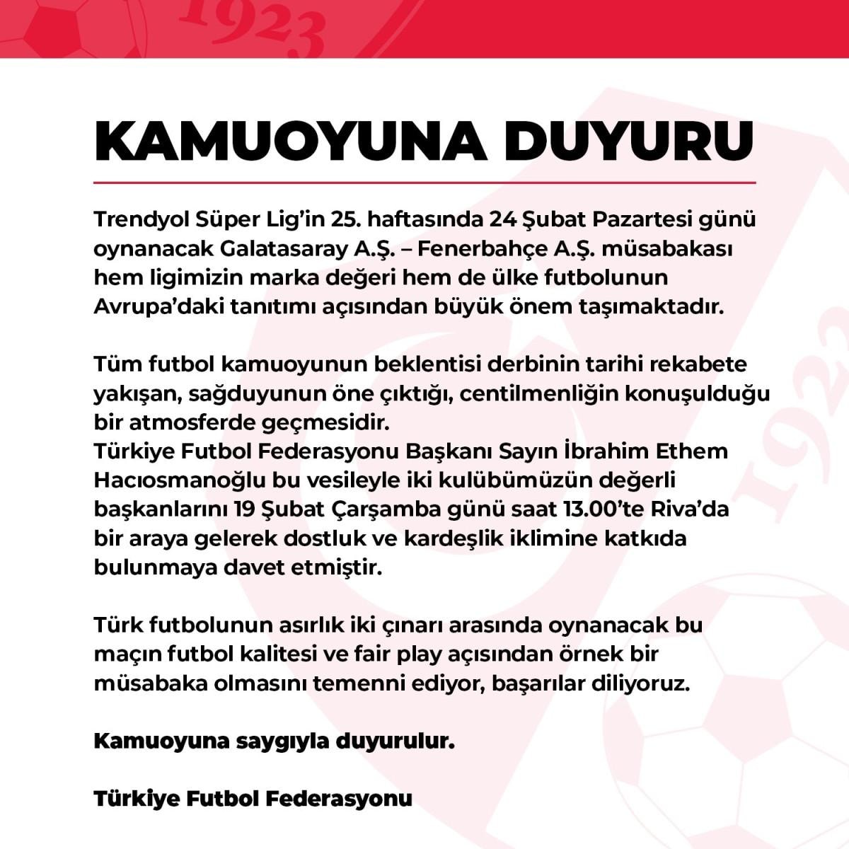 Türkiye Futbol Federasyonu Başkanı Sayın İbrahim Ethem Hacıosmanoğlu, bu vesileyle iki kulübümüzün değerli başkanlarını 19 Şubat Çarşamba günü saat 13.00'te Riva'da bir araya gelerek dostluk ve kardeşlik iklimine katkıda bulunmaya davet etmiştir.