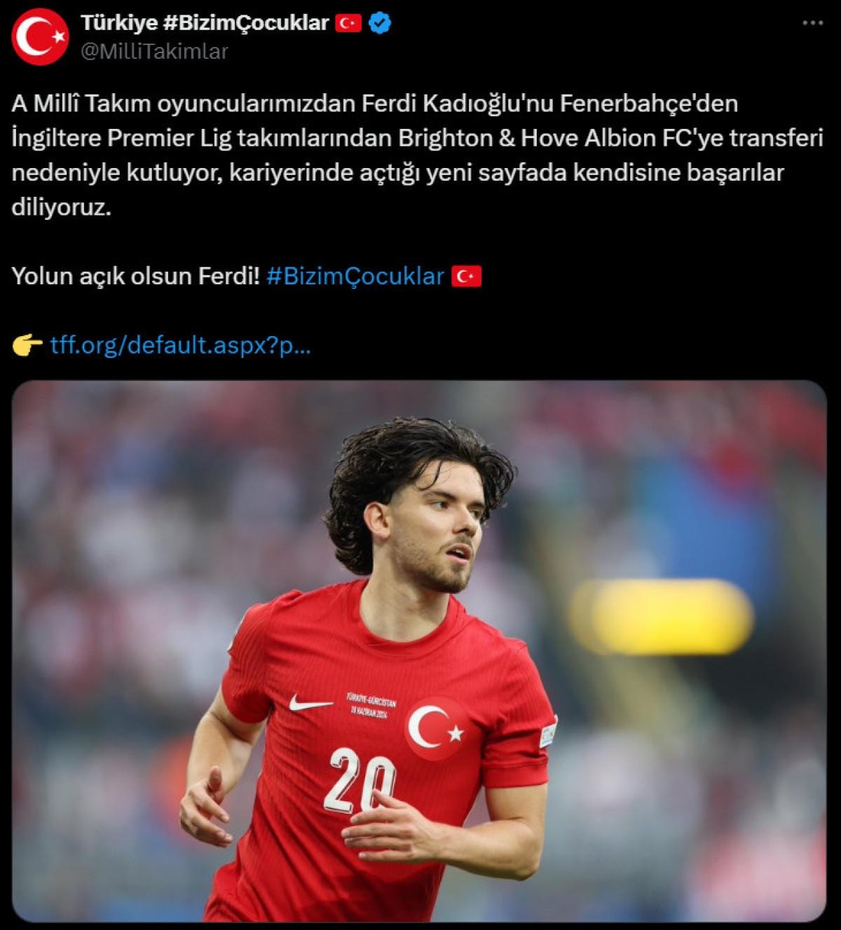 A Milli Takım oyuncularımızdan Ferdi Kadıoğlu'nu Fenerbahçe'den İngiltere Premier Lig takımlarından Brighton & Hove Albion FC'ye transferi nedeniyle kutluyor, kariyerinde açtığı yeni sayfada kendisine başarılar diliyoruz.