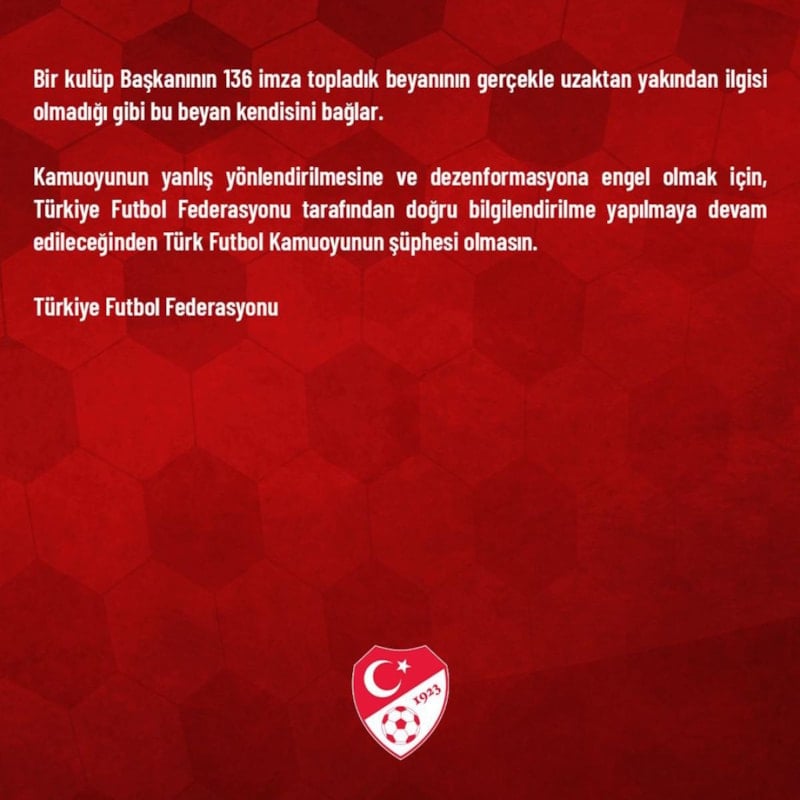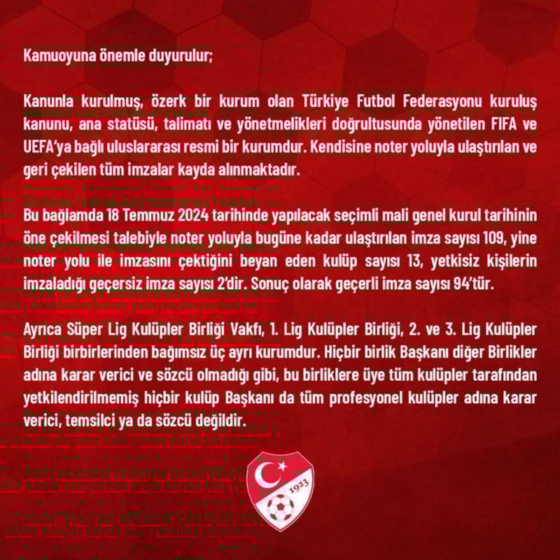 Açıklamada, geçerli imza sayısının 94 olduğu ifade edilerek, "Kamuoyunun yanlış yönlendirilmesine ve dezenformasyona engel olmak için, Türkiye Futbol Federasyonu tarafından doğru bilgilendirilme yapılmaya devam edileceğinden Türk Futbol Kamuoyunun şüphesi olmasın." denildi.