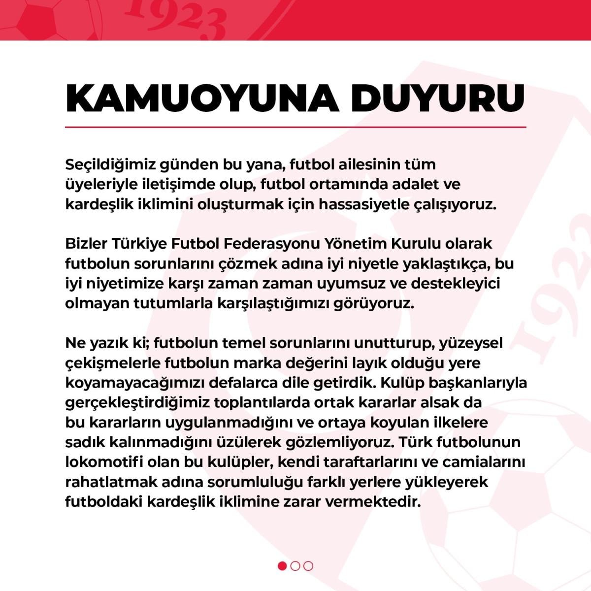 Bizler Türkiye Futbol Federasyonu Yönetim Kurulu olarak futbolun sorunlarını çözmek adına iyi niyetle yaklaştıkça, bu iyi niyetimize karşı zaman zaman uyumsuz ve destekleyici olmayan tutumlarla karşılaştığımızı görüyoruz.