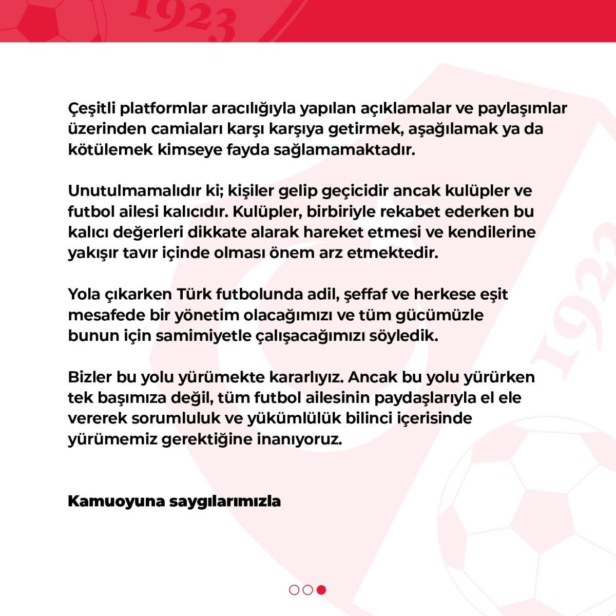 Özellikle vurgulamak isteriz ki; kamuoyu önünde yapılan açıklamalarla belli kazanımlar elde etmenin ya da yön vermeye çalışmanın herhangi bir fayda sağlamayacağını birçok kez ifade ettik. Bilinsin ki; bu dönem kapanmış ve geçmişte kalmıştır. Artık yeni ve temiz bir sayfa açılmıştır. Mevcut TFF yönetimi, futbolun içinden gelen ve futbolun temel sorunlarını bilen ve bu sorunlarla bizzat uzun yıllar boyunca mücadele etmiş bir yönetimdir. Futbol ailesinin teveccühüyle seçilmiş bir yönetim olarak bu temel sorunları çözecek güçlü ve kararlı bir iradeye sahip olduğumuzun altını çizmek isteriz.