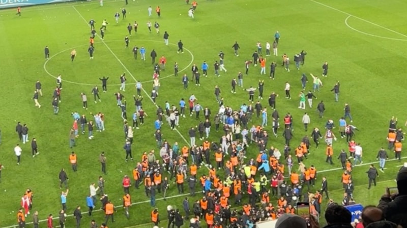 Trabzonsporlu taraftarlar maç sonrası sahaya girerek sevinen Fenerbahçeli futbolculara saldırdı.