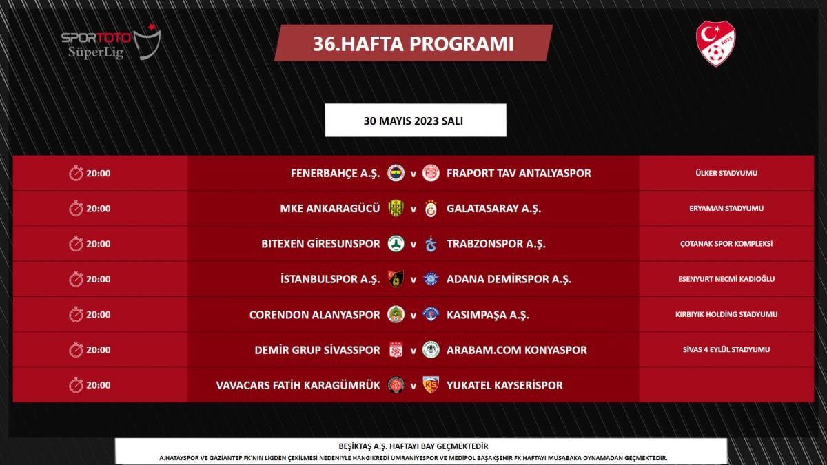Yapılan açıklamaya göre; Fenerbahçe-Antalyaspor, Ankaragücü-Galatasaray, Giresunspor-Trabzonspor, İstanbulspor-Adana Demirspor, Alanyaspor-Kasımpaşa, Sivasspor-Konyaspor ve Fatih Karagümrük-Kayserispor maçları 30 Mayıs Salı günü saat 20.00'de oynanacak.