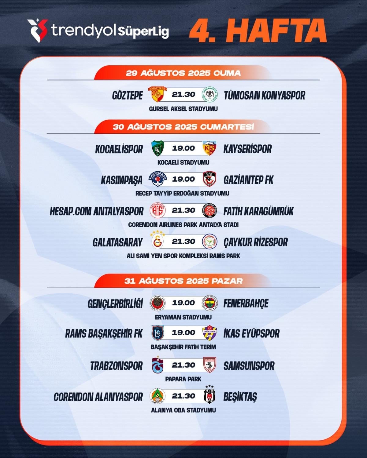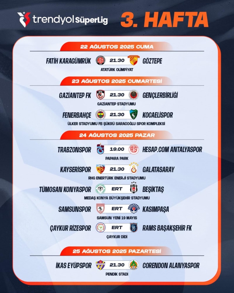 SÜPER LİG'DE 3. VE 4. HAFTANIN PROGRAMI