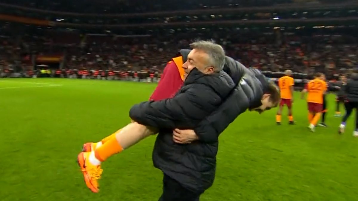 Maçın ardından Galatasaray Teknik Direktörü Domenec Torrent, Kerem'i omzuna alarak galibiyeti kutladı.