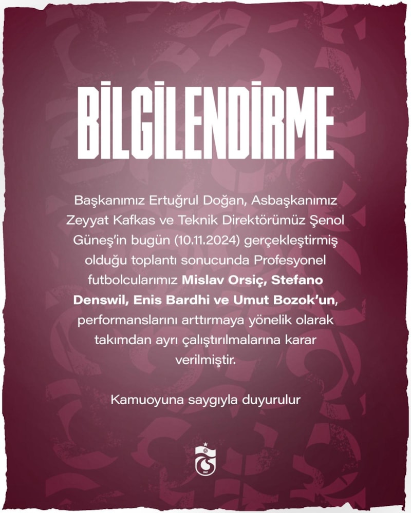 Başkanımız Ertuğrul Doğan, Asbaşkanımız Zeyyat Kafkas ve Teknik Direktörümüz Şenol Güneş’in bugün gerçekleştirmiş olduğu toplantı sonucunda Profesyonel futbolcularımız Mislav Orsiç, Stefano Denswil, Enis Bardhi ve Umut Bozok’un, performanslarını arttırmaya yönelik olarak takımdan ayrı çalıştırılmalarına karar verilmiştir.