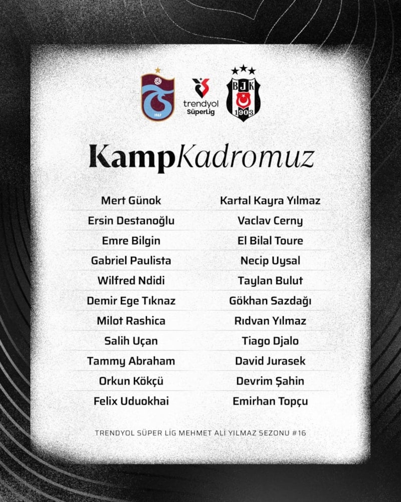 - Jota Silva, Cengiz Ünder ve Mustafa Hekimoğlu da sakatlıkları nedeniyle kadroya alınmadı.