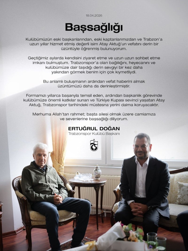 Bordo-mavili kulüpten yapılan açıklamada, "Eski futbolcumuz ve eski başkanımız Atay Aktuğ'un vefat haberini derin bir üzüntüyle öğrenmiş bulunmaktayız. Merhum Atay Aktuğ'a Allah'tan rahmet, başta ailesi olmak üzere sevenlerine ve camiamıza başsağlığı diliyoruz." ifadeleri yer aldı.