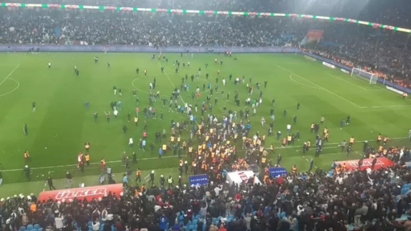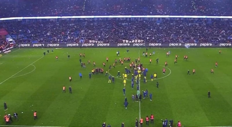 Süper Lig'in 30. haftasında oynanan Trabzonspor - Fenerbahçe maçı bitiş düdüğüyle birlikte bordo-mavili taraftarlar sahaya girdi. Olayların başladığı an kameralara yansıdı.