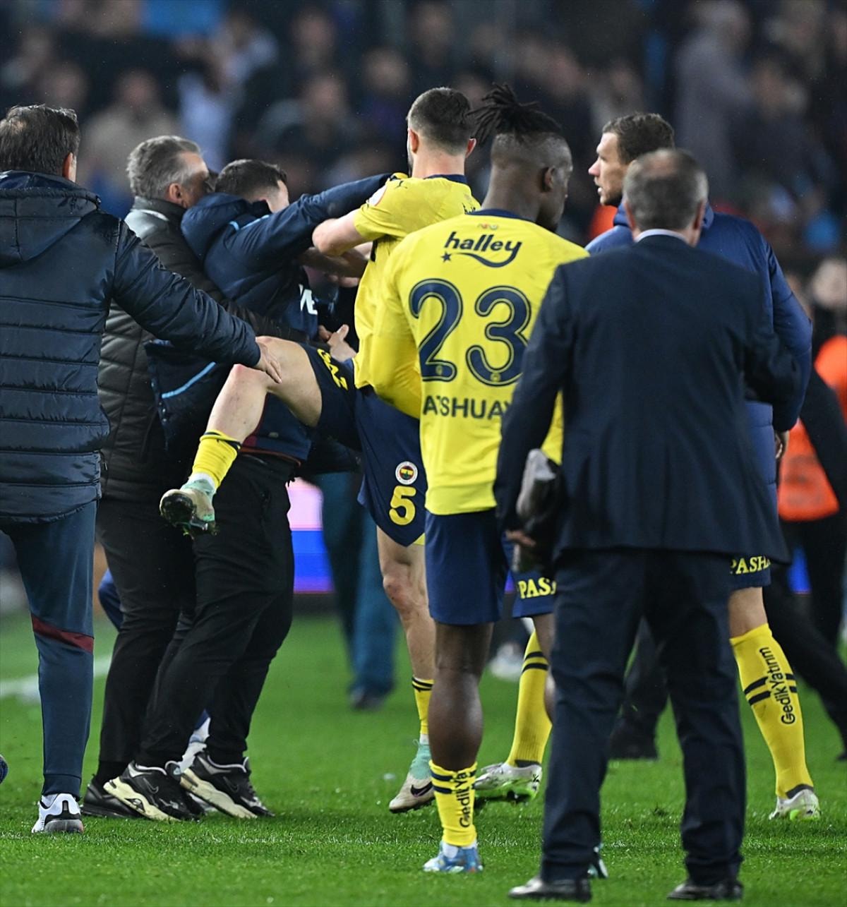 Trabzonsporlu taraftarlar, maç sonrası sahaya girerek sevinen Fenerbahçeli futbolculara saldırdı.