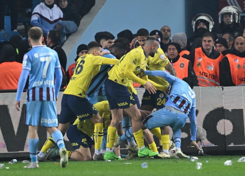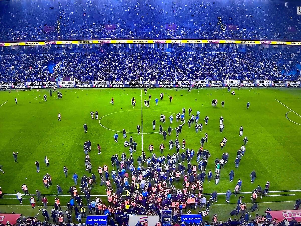 Trabzonsporlu taraftarların sahaya attığı patlayıcı madde ve su bardakları nedeniyle zaman zaman maç durdu. Karşılaşmanın orta hakemi Halil Umut Meler, sahaya atılan maddeler nedeniyle yardımcı hakemleri de orta sahaya çağırarak taraftarların sakinleşmesini bekledi.