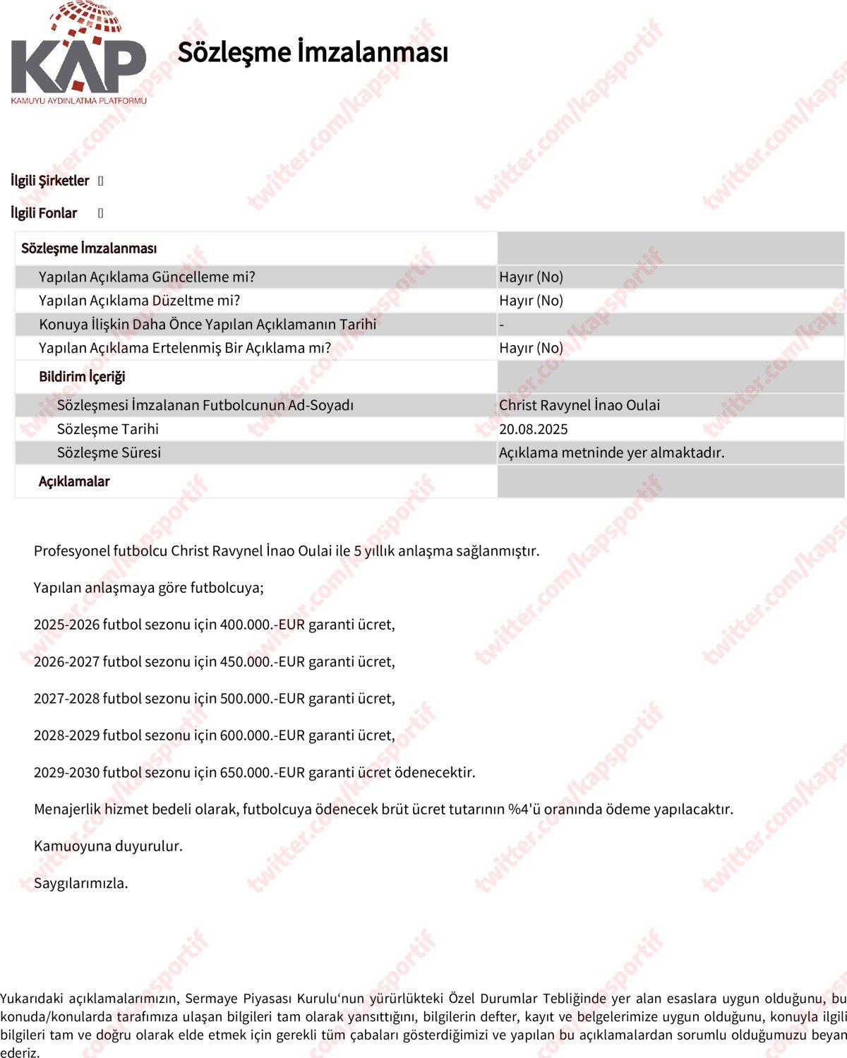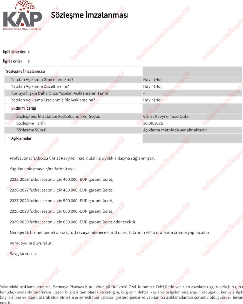 Profesyonel futbolcu Christ Inao Oulai'nin, kulübümüze kesin transferi konusunda SC Bastia ve oyuncunun kendisi ile anlaşma sağlanmıştır."