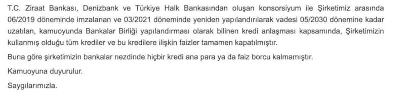 T.C. Ziraat Bankası, Denizbank ve Türkiye Halk Bankasından oluşan konsorsiyum ile Şirketimiz arasında 06/2019 döneminde imzalanan ve 03/2021 döneminde yeniden yapılandırılarak vadesi 05/2030 dönemine kadar uzatılan, kamuoyunda Bankalar Birliği yapılandırması olarak bilinen kredi anlaşması kapsamında, Şirketimizin kullanmış olduğu tüm krediler ve bu kredilere ilişkin faizler tamamen kapatılmıştır.