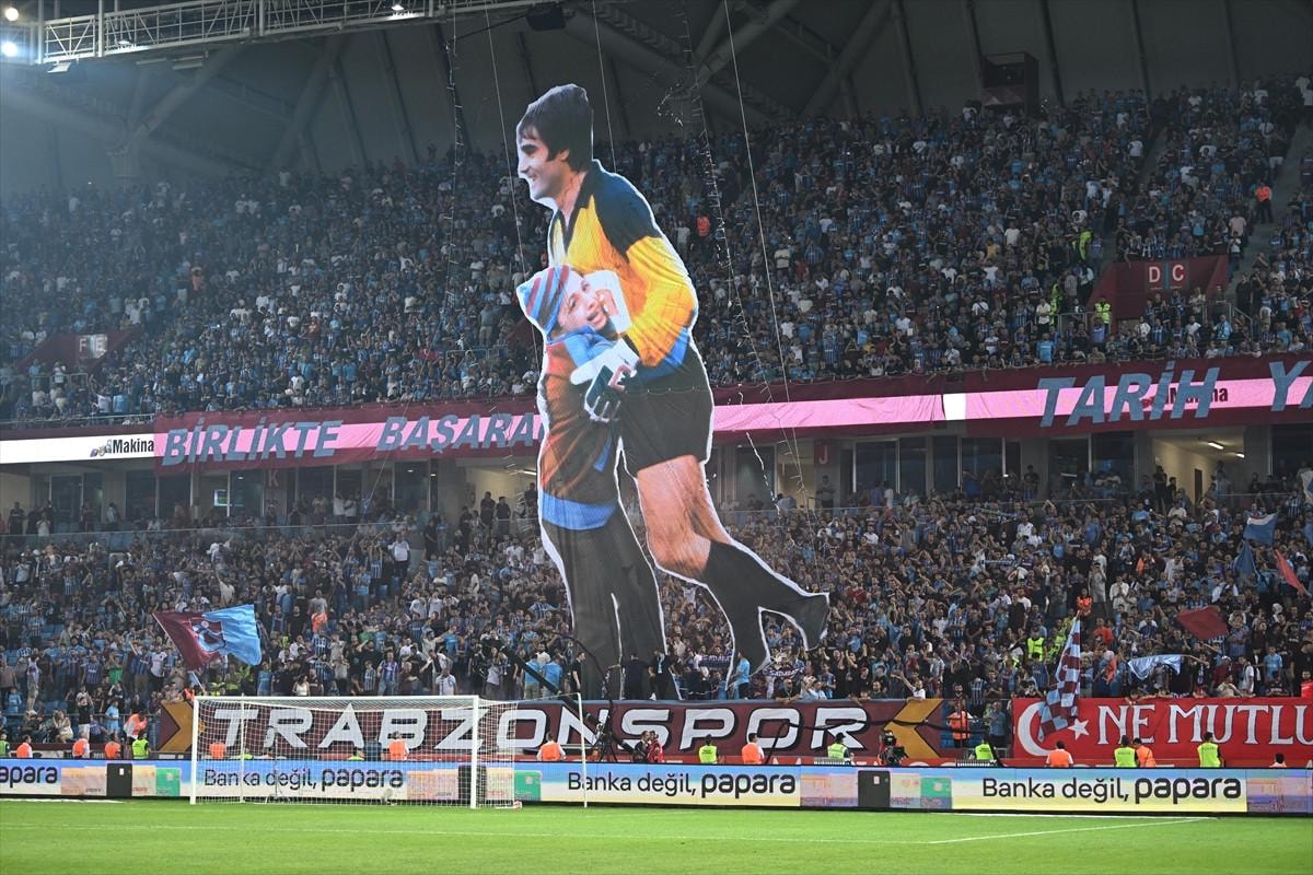 Maçın öncesinde ise tribünleri dolduran Trabzonsporlu futbolseverler, görsel bir şölene imza attı.