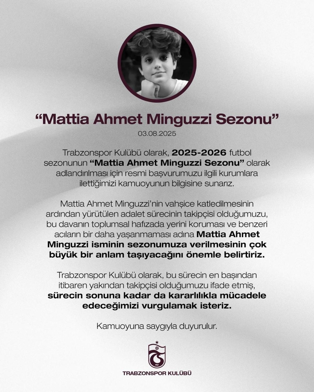 "Trabzonspor Kulübü olarak, 2025-2026 futbol sezonunun "Mattia Ahmet Minguzzi Sezonu" olarak adlandırılması için resmi başvurumuzu ilgili kurumlara ilettiğimizi kamuoyunun bilgisine sunarız. Mattia Ahmet Minguzzi’nin vahşice katledilmesinin ardından yürütülen adalet sürecinin takipçisi olduğumuzu, bu davanın toplumsal hafızada yerini koruması ve benzeri acıların bir daha yaşanmaması adına Mattia Ahmet Minguzzi isminin sezonumuza verilmesinin çok büyük bir anlam taşıyacağını önemle belirtiriz. Trabzonspor Kulübü olarak, bu sürecin en başından itibaren yakından takipçisi olduğumuzu ifade etmiş, sürecin sonuna kadar da kararlılıkla mücadele edeceğimizi vurgulamak isteriz"