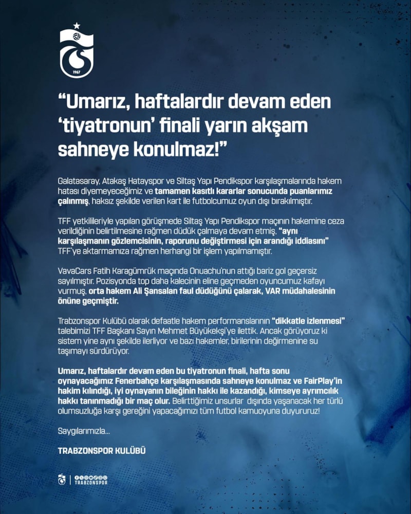 Trabzonspor Kulübü olarak defaatle hakem performanslarının "dikkatle izlenmesi" talebimizi TFF Başkanı Sayın Mehmet Büyükekşi'ye ilettik. Ancak görüyoruz ki sistem yine aynı şekilde ilerliyor ve bazı hakemler, birilerinin değirmenine su taşımayı sürdürüyor.