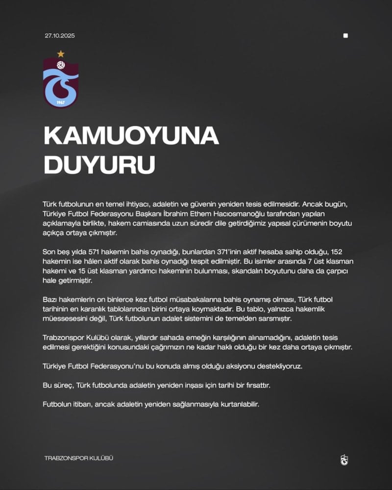 Türk futbolunun en temel ihtiyacı, adaletin ve güvenin yeniden tesis edilmesidir. Ancak bugün, Türkiye Futbol Federasyonu Başkanı İbrahim Ethem Hacıosmanoğlu tarafından yapılan açıklamayla birlikte, hakem camiasında uzun süredir dile getirdiğimiz yapısal çürümenin boyutu açıkça ortaya çıkmıştır. Son beş yılda 571 hakemin bahis oynadığı, bunlardan 371’inin aktif hesaba sahip olduğu, 152 hakemin ise hâlen aktif olarak bahis oynadığı tespit edilmiştir. Bu isimler arasında 7 üst klasman hakemi ve 15 üst klasman yardımcı hakeminin bulunması, skandalın boyutunu daha da çarpıcı hale getirmiştir. Bazı hakemlerin on binlerce kez futbol müsabakalarına bahis oynamış olması, Türk futbol tarihinin en karanlık tablolarından birini ortaya koymaktadır. Bu tablo, yalnızca hakemlik müessesesini değil, Türk futbolunun adalet sistemini de temelden sarsmıştır. Trabzonspor Kulübü olarak, yıllardır sahada emeğin karşılığının alınamadığını, adaletin tesis edilmesi gerektiğini konusundaki çağrımızın ne kadar haklı olduğu bir kez daha ortaya çıkmıştır. Türkiye Futbol Federasyonu’nu bu konuda almış olduğu aksiyonu destekliyoruz. Bu süreç, Türk futbolunda adaletin yeniden inşası için tarihi bir fırsattır. Futbolun itibarı, ancak adaletin yeniden sağlanmasıyla kurtarılabilir.