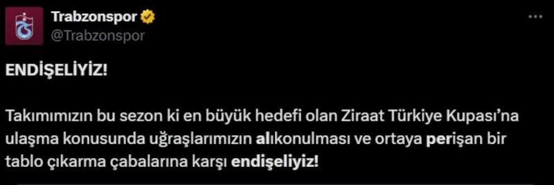 Takımımızın bu sezonki en büyük hedefi olan Ziraat Türkiye Kupası’na ulaşma konusunda uğraşlarımızın alıkonulması ve ortaya perişan bir tablo çıkarma çabalarına karşı endişeliyiz!